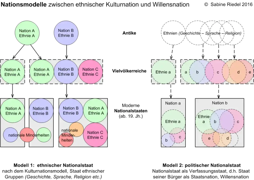 Das Konzept der Nation und ihres Nationalstaats in seiner heutigen Form geht auf die Vordenker und Aktivisten der Französischen Revolution (1789) zurück. Bis zu dieser Zeit bezeichnete „Nation“ eine Gemeinschaft von Mitgliedern der gleichen Herkunft oder Abstammung (vgl. lat. natio, abgeleitet vom Verb nasci – geboren werden). Von politischen Rechten der Nationsangehörigen war noch keine Rede, bis die gesellschaftlichen Umwälzungen Ende des 18. und Mitte des 19. Jahrhunderts in Europa zum Sturz der absolutistisch regierenden Monarchen führten. In den neuen konstitutionellen Monarchien oder Republiken konnte sich nun die „Nation“ zu einer politischen Größe entwickeln und das Recht einfordern, auch der höchste Souverän im Staat zu sein. Ein solches demokratisches Konzept etablierte sich jedoch erst nach dem Ersten Weltkrieg (1914-18), nachdem die europäischen Königshäuser trotz engster dynastischer Verbindungen ihre Völker bzw. angehenden Nationen in einen ruinösen Konflikt hineingetrieben und ihre Länder zu großen Teilen zerstört hatten.