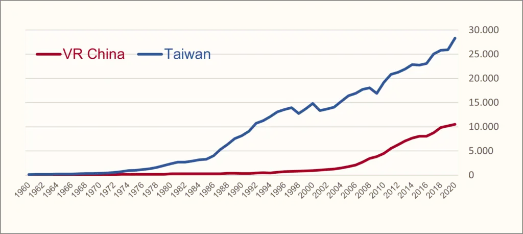 Bruttoinlandsprodukt pro Kopf in US-Dollar Taiwans und der Volksrepublik China (1960-2020)