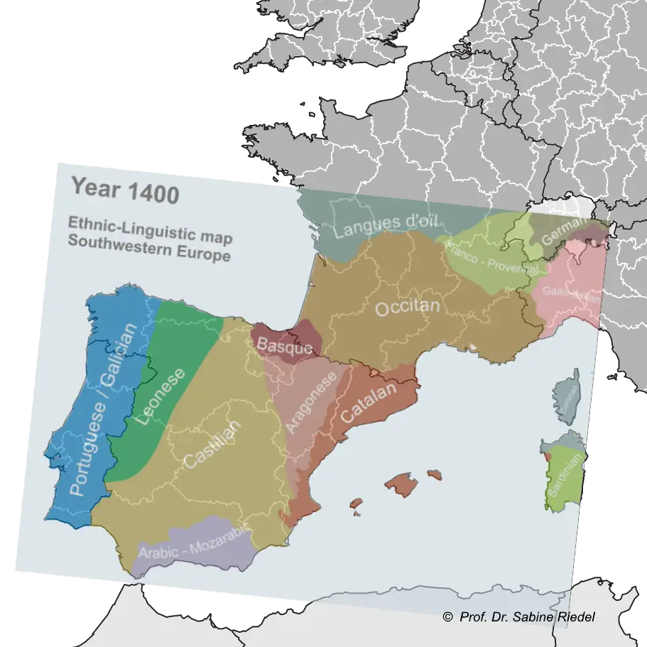 Alexandre Vigo, Chronological map showing linguistic evolution in southwest Europe from A.D. 1000-2000, in: History of Catalan, wikipedia, 14.6.2009.
