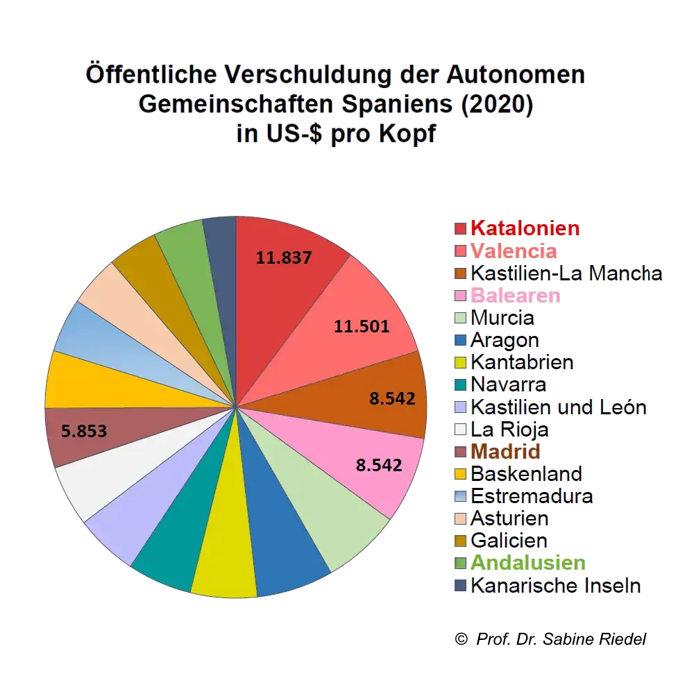 ♦ Katalonien ist nicht nur die reichste autonome Gemeinschaft Spaniens, sondern auch die mit den höchsten öffentlichen Schulden. Seit der spanischen Bankenkrise in 2012 muss die Zentralregierung Katalonien mit Krediten aus dem Liquiditätsfonds stützen, d.h. mit Geld aus allen spanischen Regionen.