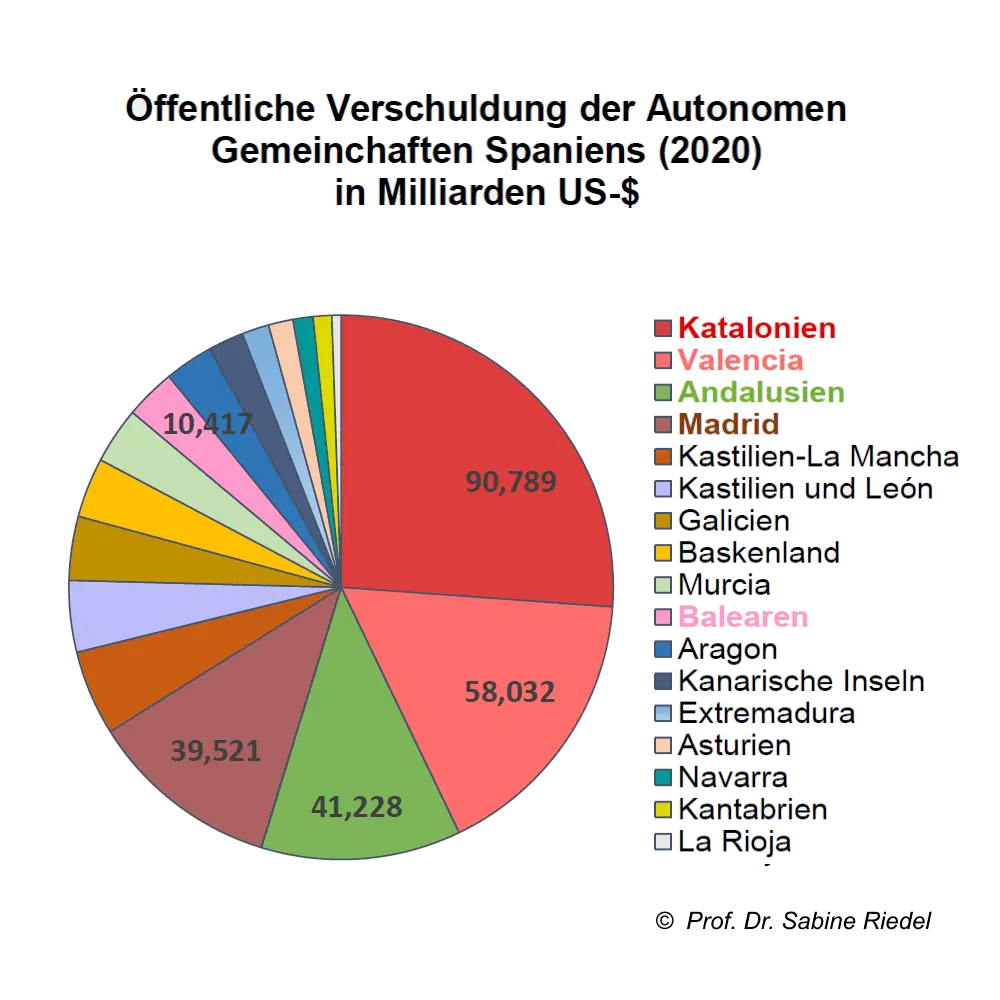 ♦ Erklärtes Ziel Kataloniens ist die volle finanzielle Selbstverwaltung. Doch damit besteht für Spanien die Gefahr einer wachsenden öffentlichen Staatsverschuldung, die heute schon bei über 100 Prozent des Bruttoinlandsprodukts (BIP) liegt, 40 Prozent über der kritischen Marke des Euro-Stabilitätspakts.