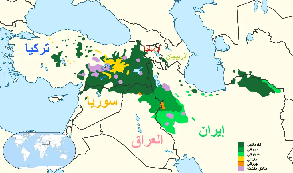 منطقة التوزيع المقدرة للغة (اللغات) الكردية