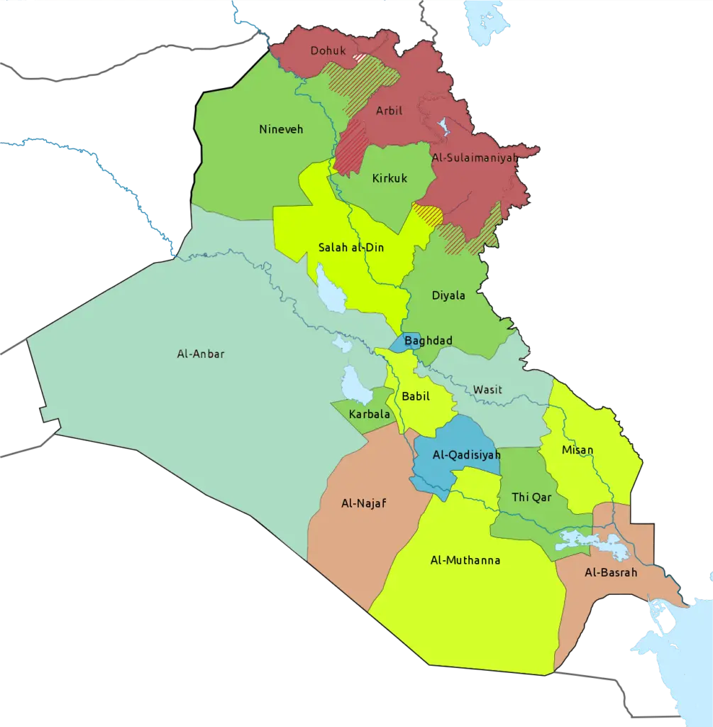 Quellen: Zusammenstellung zweier Karten: Rafy, Irakische Gouvernements, in: Wikipedia, 25.1.2011 und Location of Kurdistan in Iraq, in: Wikivoyage.org, 25.10.2017